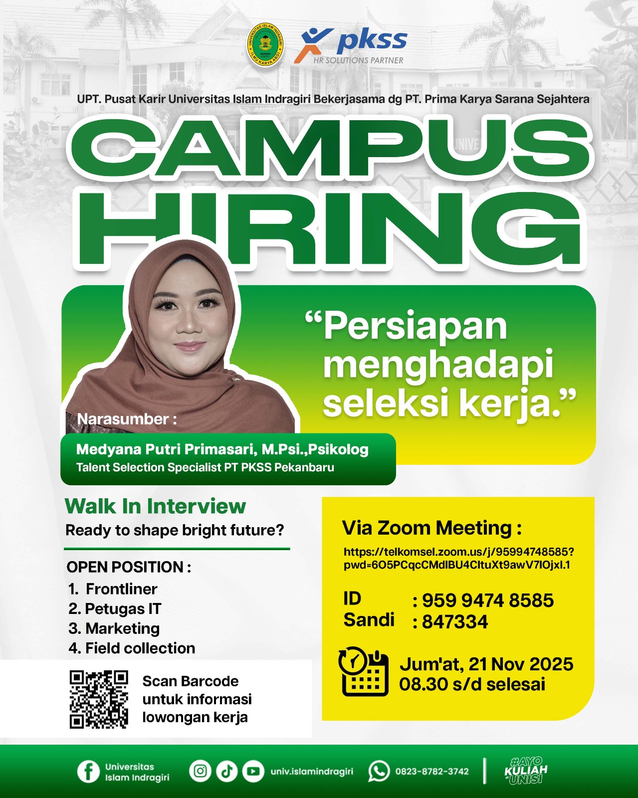 Diumumkan kepada seluruh Alumni dan Calon Wisudawan Universitas Islam Indragiri Tahun 2025 agar dapat mengikuti “Campus Hiring, Worshop Persiapan Karir, dan Job Fair Universitas Islam Indragiri Tahun 2025” yang dilaksanakan oleh UPT. Pusat Karier dan Tracer Study Universitas Islam Indragiri bekerja sama dg PT. Prima Karya Sarana Sejahtera (PKSS) Pekanbaru secara DARING pada: