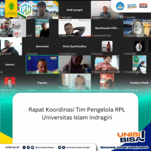 Tembilahan – Selasa 20 Agustus 2024 dilaksanakan rapat koordinasi kesiapan pelaksanaan Rekognisi Pembelajaran Lampau Universitas Islam Indragiri, kegiatan dilaksanakan secara zoom, diikuti oleh Rektor, Wakil Rektor dan Kabag dan Kasubbag bidang Akademik dan Pengembangan, Wakil Rektor Bidang Administrasi Umum, Keuangan dan Kepegawaian , Dekan dan Kaprodi Se-Universitsas Islam Indragiri, Ketua dan Sekretaris Lembaga Promosi dan Humas, Ketua dan Sekretaris Lembaga Pengembangan, Pembelajaran dan Penjaminan Mutu, Ketua dan Sekretaris LPPM, Ketua PUSTIPAD Universitas Islam Indragiri serta Tim Pengelola RPL Universitas Islam Indragiri